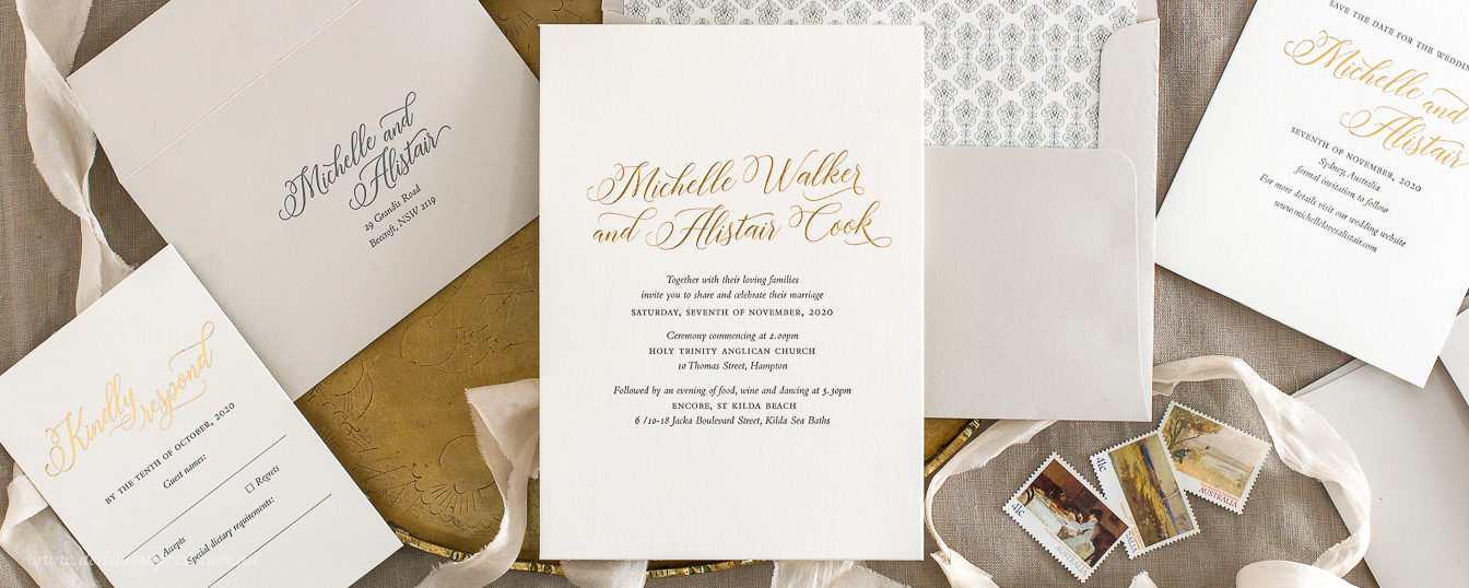 Custom Designed Gold Foil Letterpress Wedding Invitations Wouldn