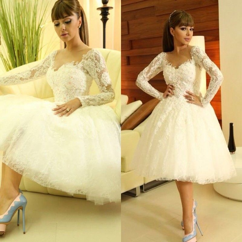 Illusion Top Lace Knee Length Wedding Dresses With Long Sleeves