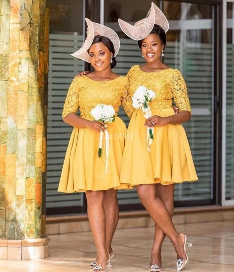 2020 Yellow Scoop Neck Lace Bridesmaid Dresses Half Sleeve Knee